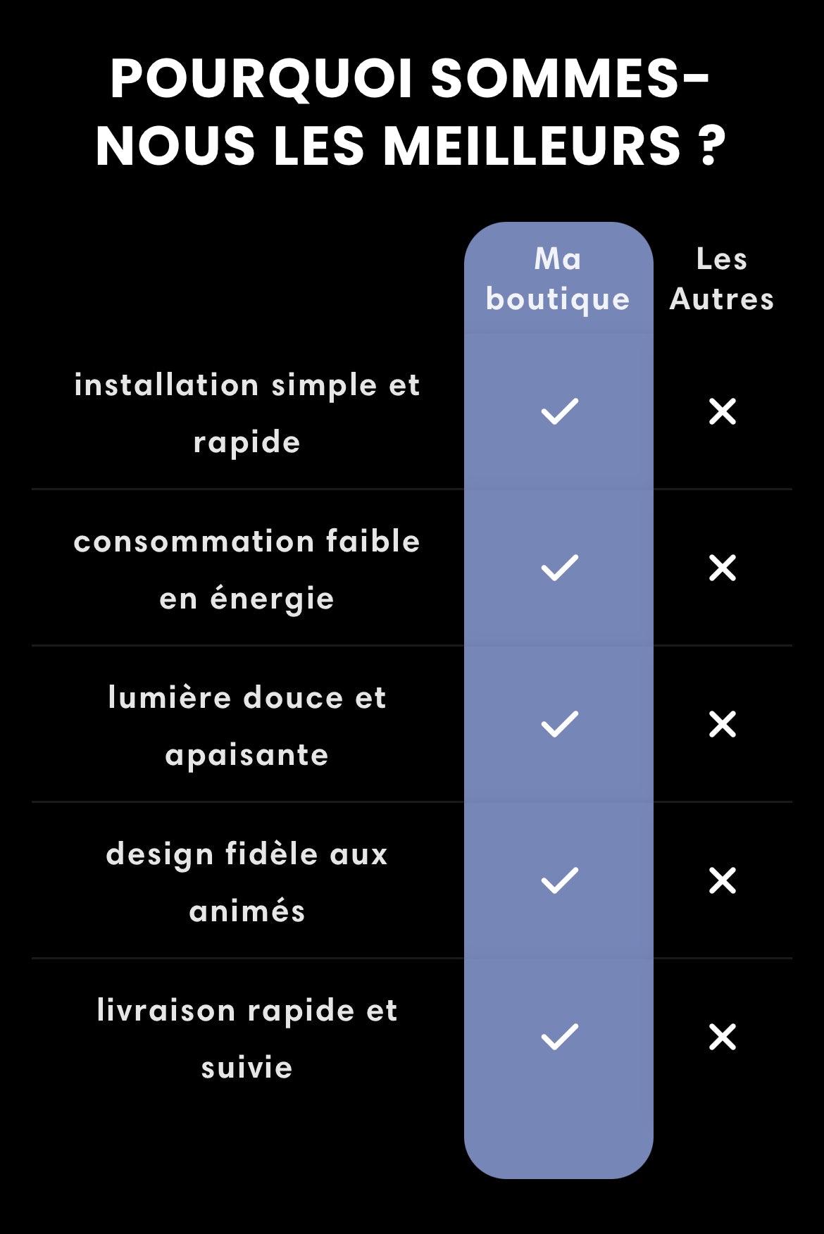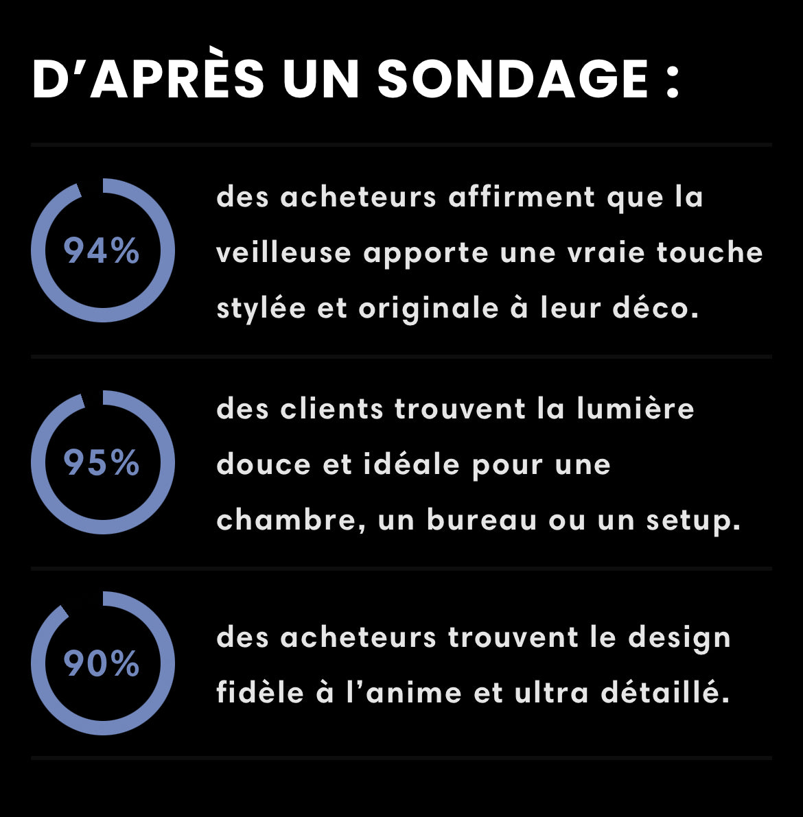 Ne rate pas l’occasion ! La livraison est offerte sur toutes les commandes passées avant minuit. C’est le moment parfait pour te faire plaisir sans frais supplémentaires, ou pour offrir une veilleuse à un(e) fan d’anime. Profite-en tant que l’offre est active !